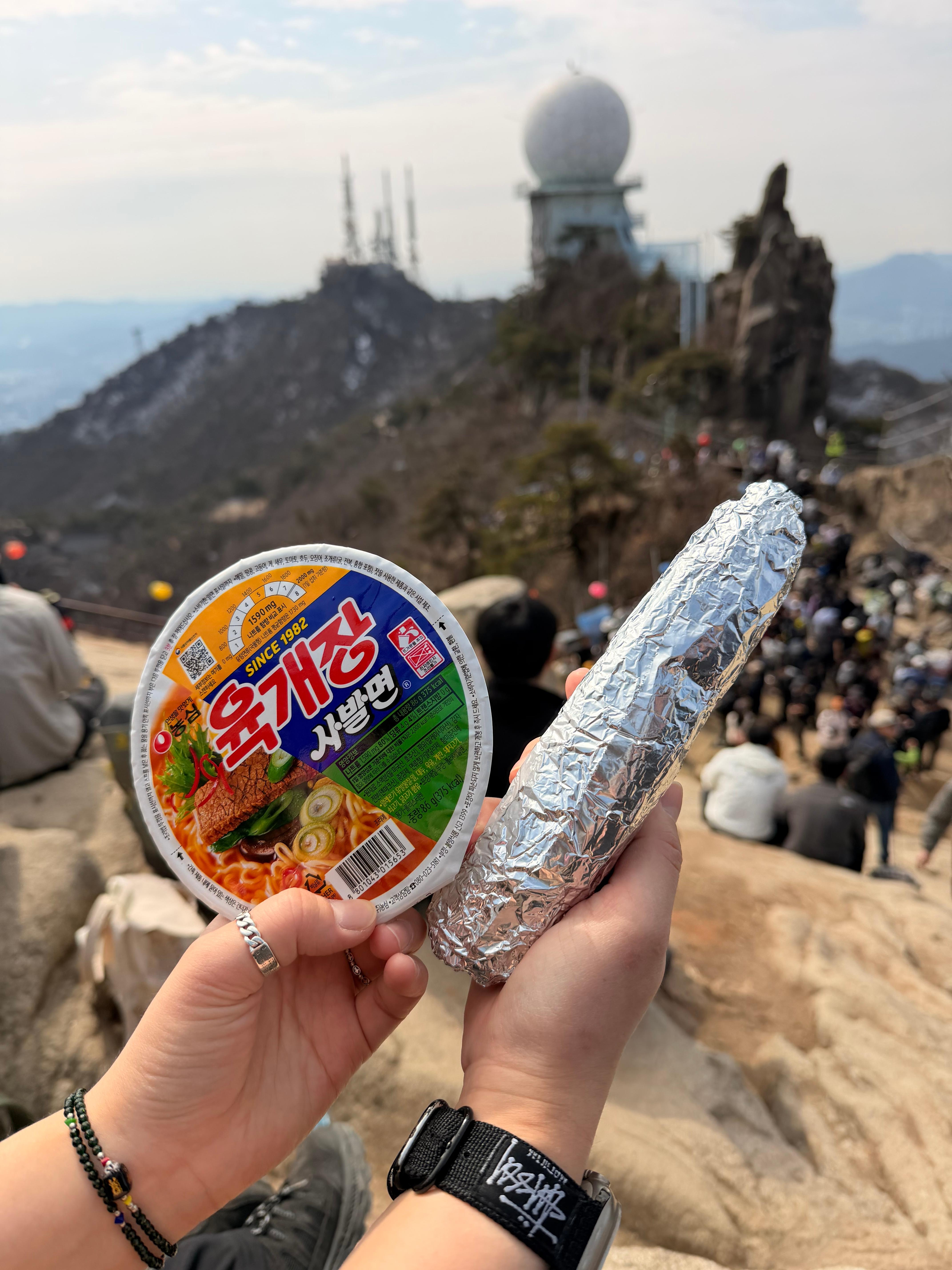 연주암 매점에서는 여러 가지 간식을 팔고 있었지만, 메인은 역시 컵라면이었습니다. 종류는 튀김우동과 신라면 두 가지였고 가격은 전부 3,000원씩으로 동일했습니다. 커다란 보온통에 뜨거운 물을 직접 받을 수 있는 곳도 깔끔하게 마련되어 있어서 아주 편리했습니다. 저희도 얼른 라면을 하나씩 사서, 아침에 준비해 온 김밥과 함께 꿀맛 같은 산중 만찬을 즐겼습니다. 고된 산행 끝에 찬 바람을 맞으며 호호 불어 먹는 국물 맛은 미슐랭 식당 부럽지 않았습니다.