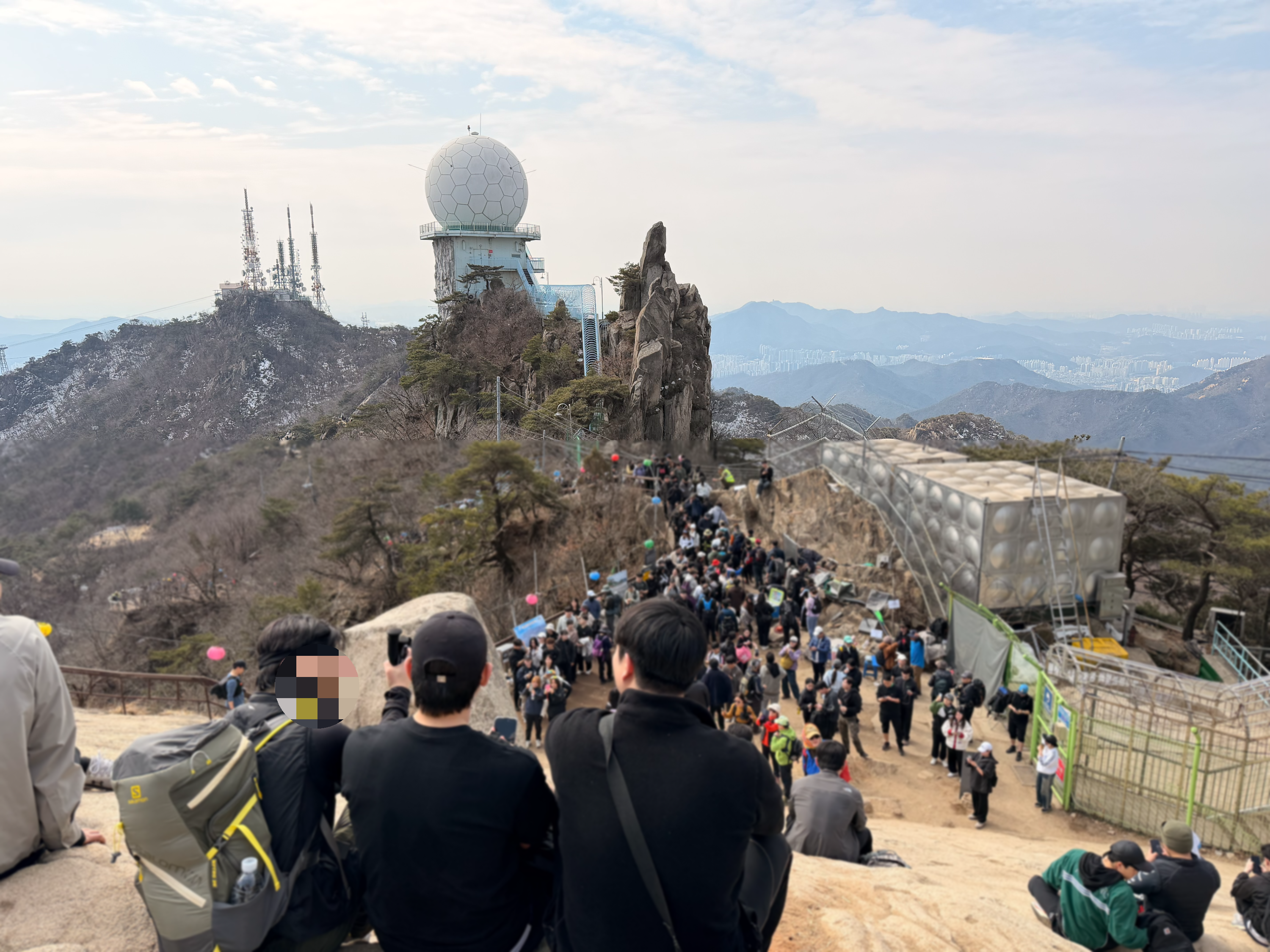 아찔했던 암릉 구간을 넘어 관악산 정상부를 찍고, 다시 한번 숨을 고르고 향한 관악산 정상은 말 그대로 인산인해, 미친 듯이 사람이 많았습니다. 정상석 앞에는 인증샷을 남기기 위한 대기 줄이 끝도 없이 이어져 있었고, 심지어 언론사인지 방송국 어디에선가 카메라를 들고 와서 사람들을 인터뷰하는 진풍경도 벌어지고 있었습니다. 생기 넘치는 정상의 분위기를 느끼며, 작년에 동네 뒷산 한 번 가본 게 전부인 저로서는 개인적으로 쉽지 않은 산행이었음을 다시금 실감했습니다.