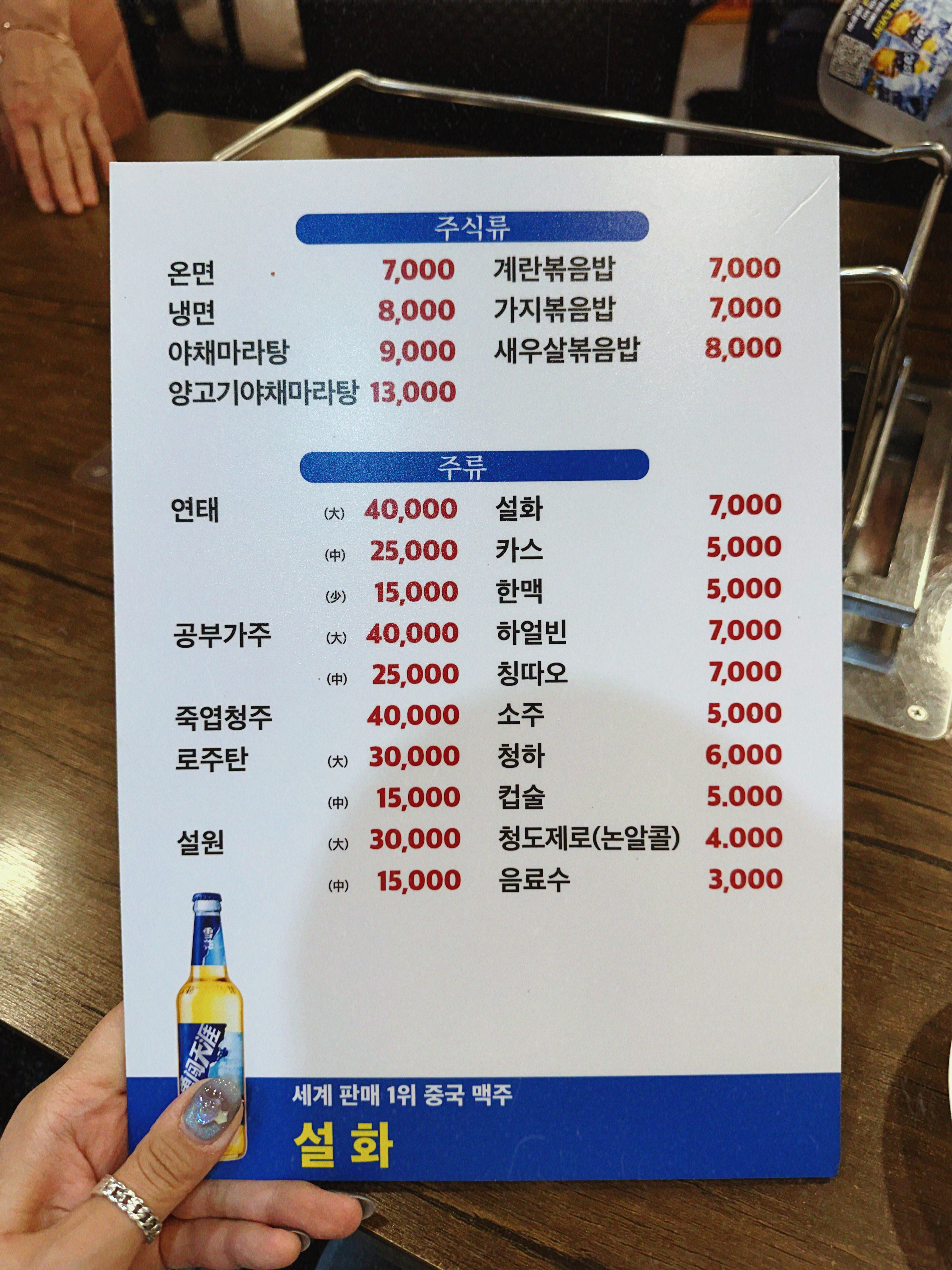 메뉴판 살펴보니, 기본 양꼬치부터 전골류까지 꽤 다양했어. 난 기본에 충실하게 오리지널 양꼬치랑 마라맛 양꼬치를 시켰어. 메뉴판에는 한자로 표기된 것들도 친절히 한글로 적혀있어서 선택할 때 어렵지 않더라구. 마라탕, 꿔바로우, 그리고 깔끔하게 온면도 추천 메뉴로 강력 추천하는 분위기였어.