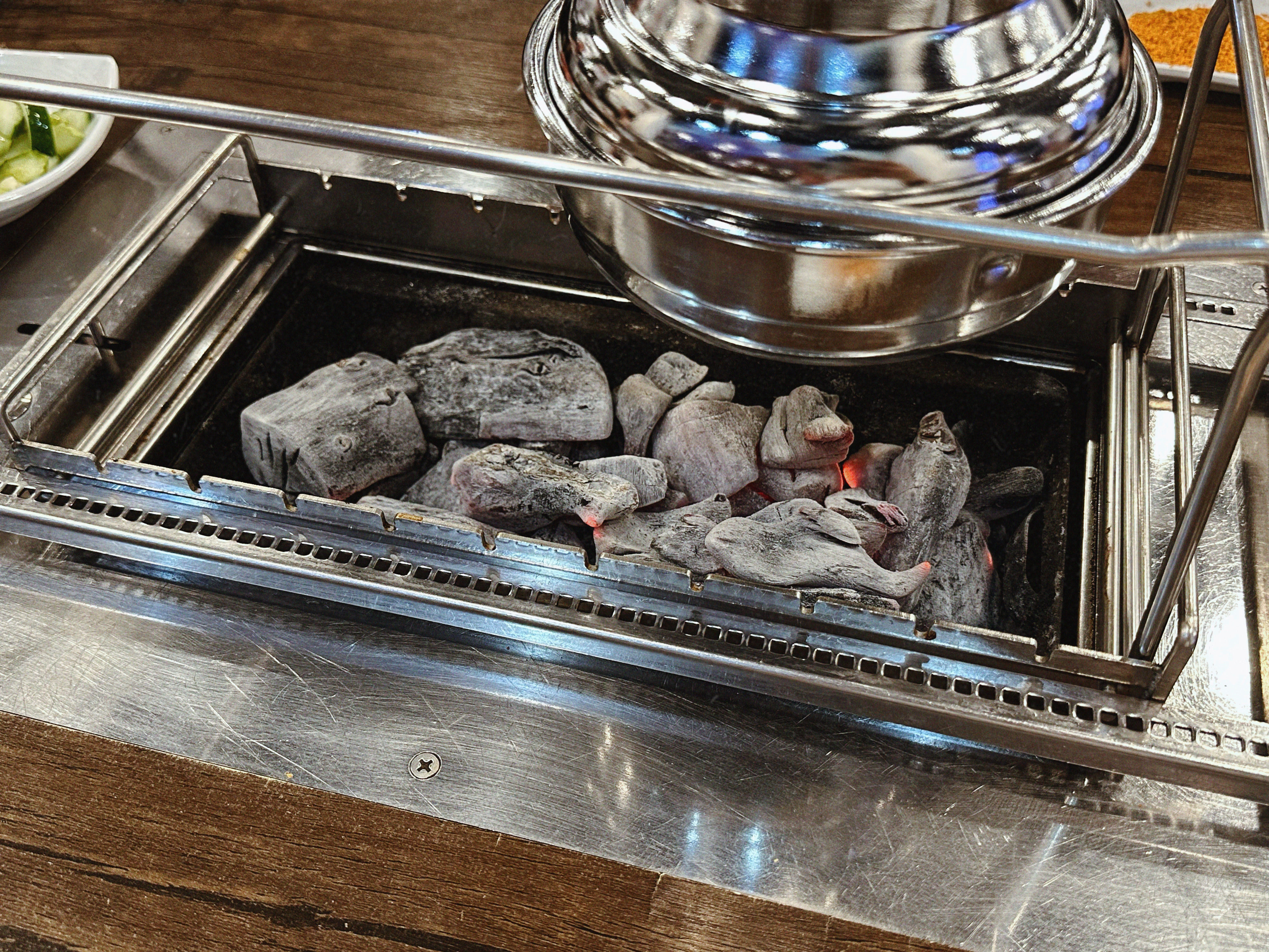 문 열자마자 바로 코 끝을 찌르는 화로 냄새! 내가 바로 이 집 와서 냄새 맡고 확신했잖아. 여기는 찐이다 싶었어. 내부는 깔끔하고 좌석 간격도 꽤 넓어서 단체 모임이나 친구들이랑 와도 전혀 불편하지 않을 정도였어. 화로들이 돌출돼 있는 게 딱 중국 본토 느낌 나더라고. 직원 분들도 계속 활기차서 꽤 흐뭇하게 시작했어.