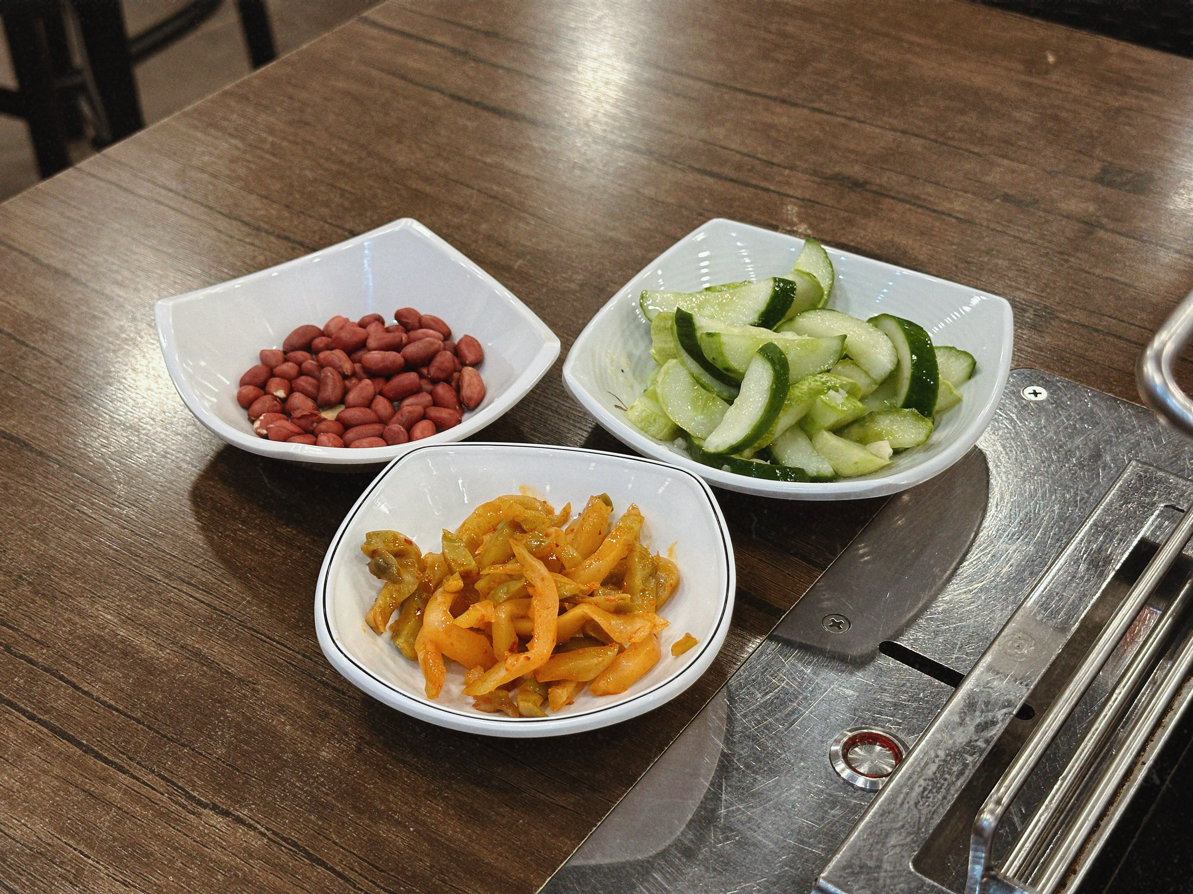밑반찬도 좋았어. 오른쪽 사진에 아래는 짜사이로, 짜사이는 아무래도 절임이기 때문에 조금 짰지만 오이무침은 간이 기가 막혔어! 양꼬치엔 빠질 수 없는 땅콩까지! 아주 완벽 그잡채였지.