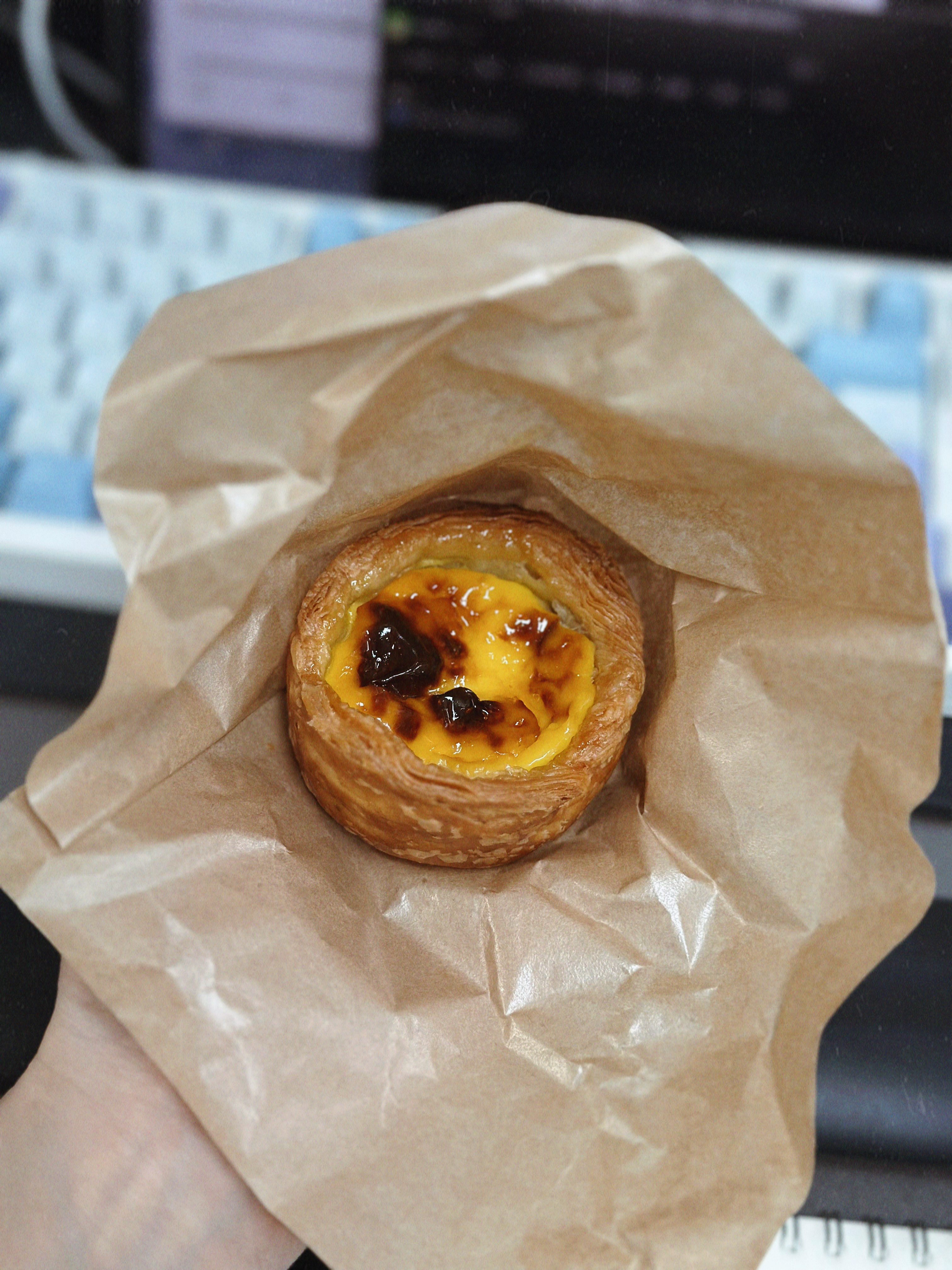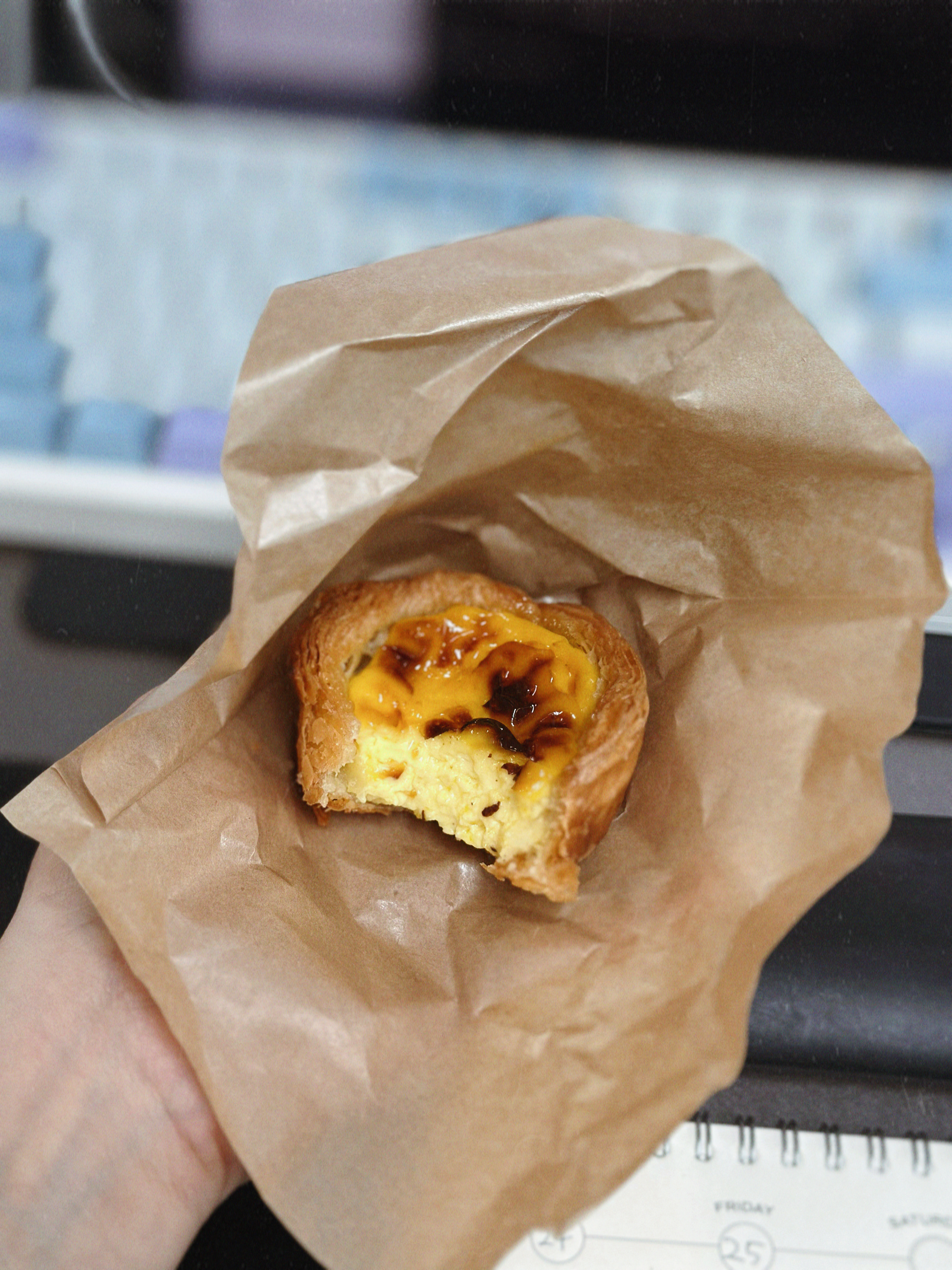 사실 에그타르트는 파드레 베이커리의 시그니처 메뉴답게, 결이 살아있는 페스츄리와 촉촉한 커스터드 크림 조화가 훌륭했어요. 한 입 먹을 때마다 페스츄리의 바삭함이 ASMR처럼 귀에 맴도는 그 소리, 직접 먹어보면 왜 인기 메뉴인지 바로 알 수 있을 정도! 가격은 3,200원이지만, 퀄리티를 생각하면 합리적인 선택이었습니다.