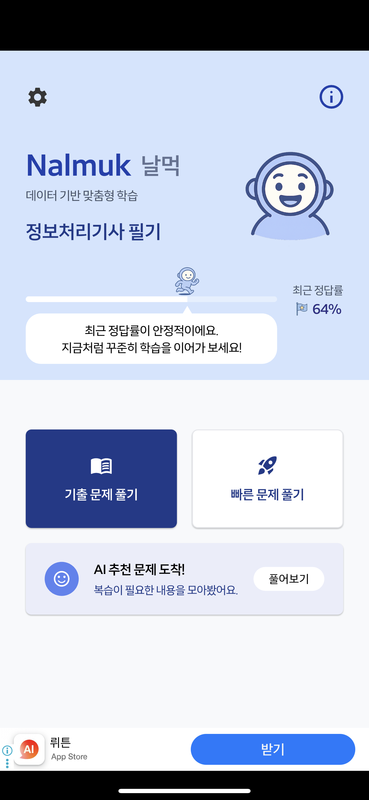 - AI 추천 문제, 최근 정답률, 기출 문제 따로 풀기 기능까지 있음.