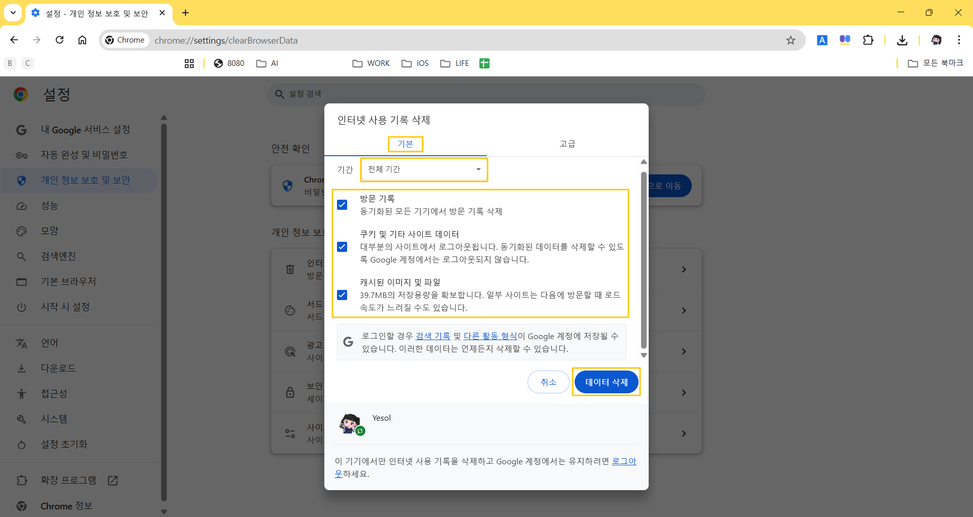 삭제할 항목에서 "비밀번호 및 기타 로그인 데이터"만 체크 해제한 뒤, 나머지 항목을 모두 선택합니다. 그리고 기간은 마찬가지로 전체 기간으로 지정한 후 데이터 삭제 버튼을 누르면 됩니다.