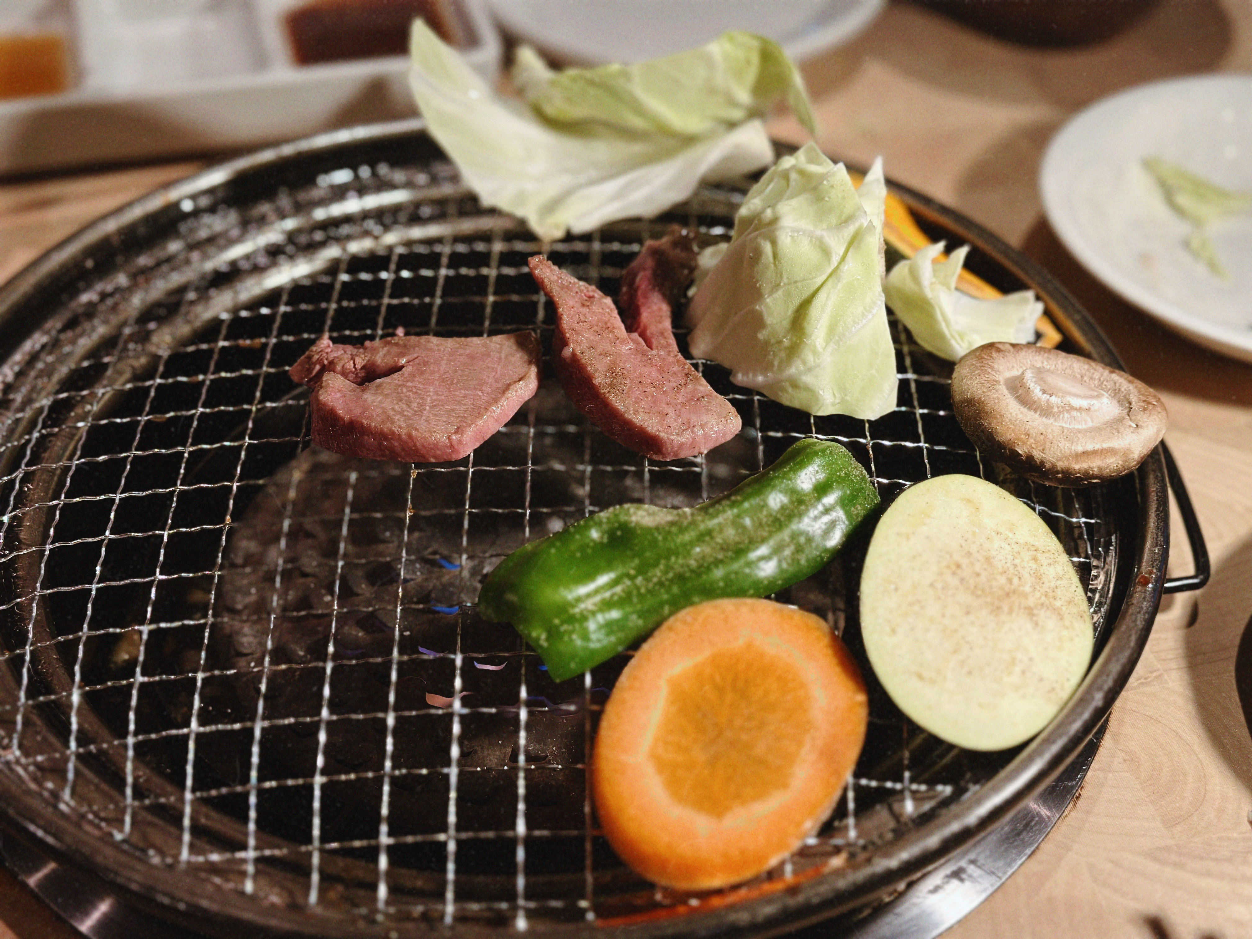양배추 식초 무침은 일종의 양배추 피클 같은 느낌으로 느끼함을 지워주는 상큼한 리셋 버튼 역할을 했고, 야채 3종(버섯·당근·피망·가지 등 당일 구성)은 불판 한켠에서 은은히 구워 입가심처럼 곁들이기 좋았어요. 특히 버섯은 육즙을 품듯 익어 고기 기름의 풍미와 잘 어울렸습니다. 곁들임이 너무 강하면 고기 맛을 가릴 수 있는데, 야키니쿠 하야토의 사이드는 균형감이 좋아 고기의 장점을 살려줍니다. 소스류는 기본 간장 베이스와 소금 위주로 심플했고, 필요하면 레몬을 더해 개운하게 마무리할 수 있었어요.