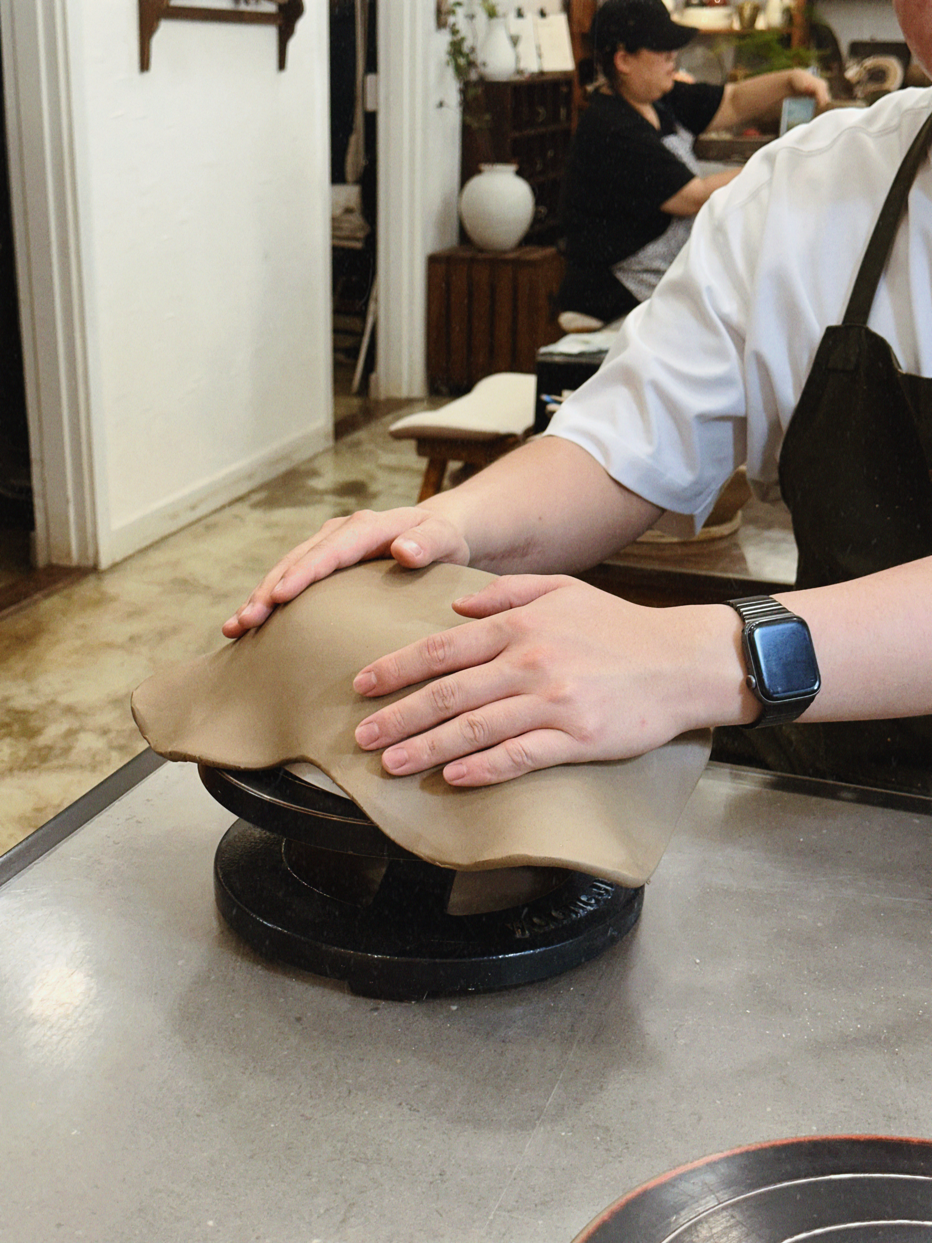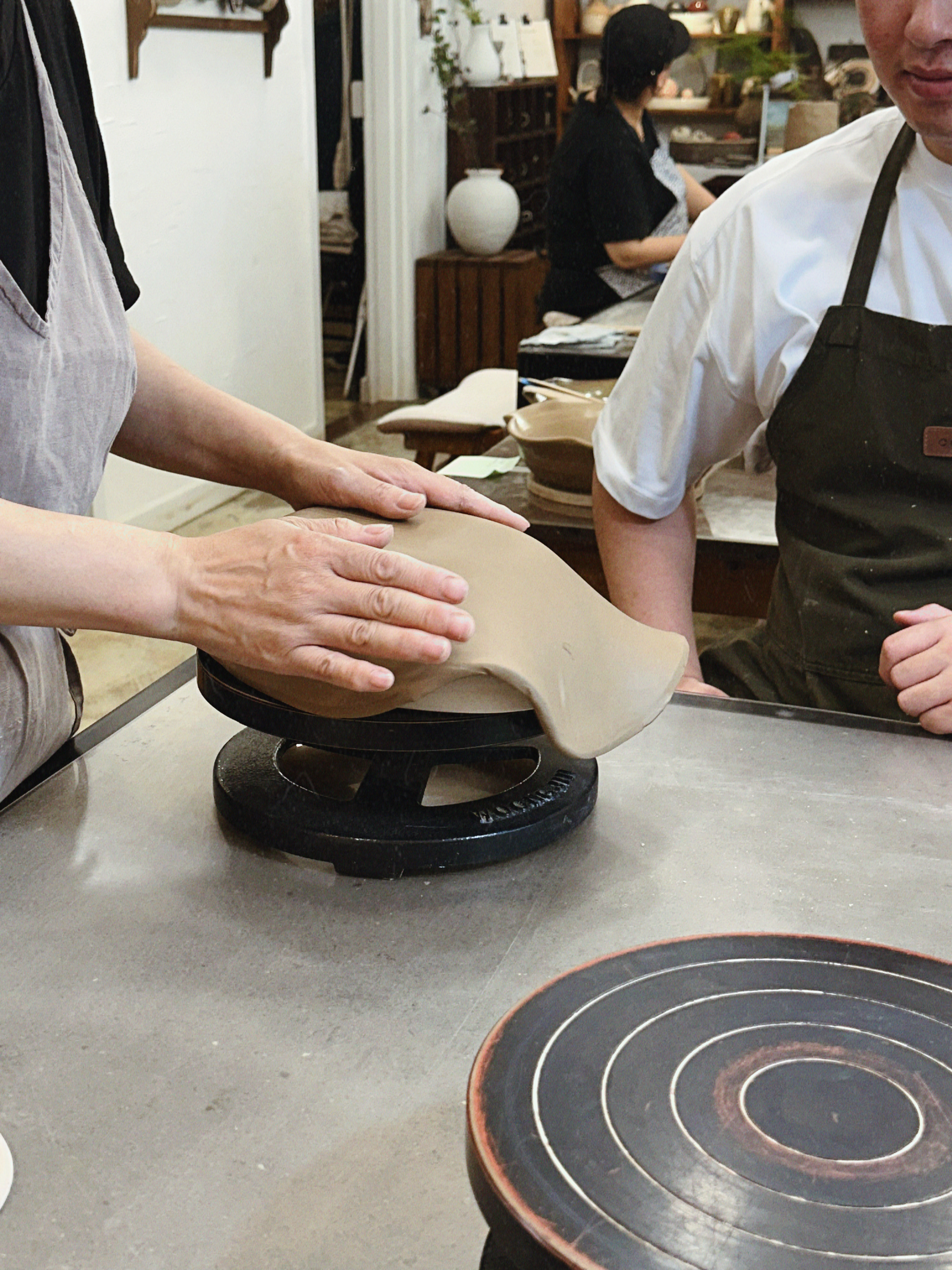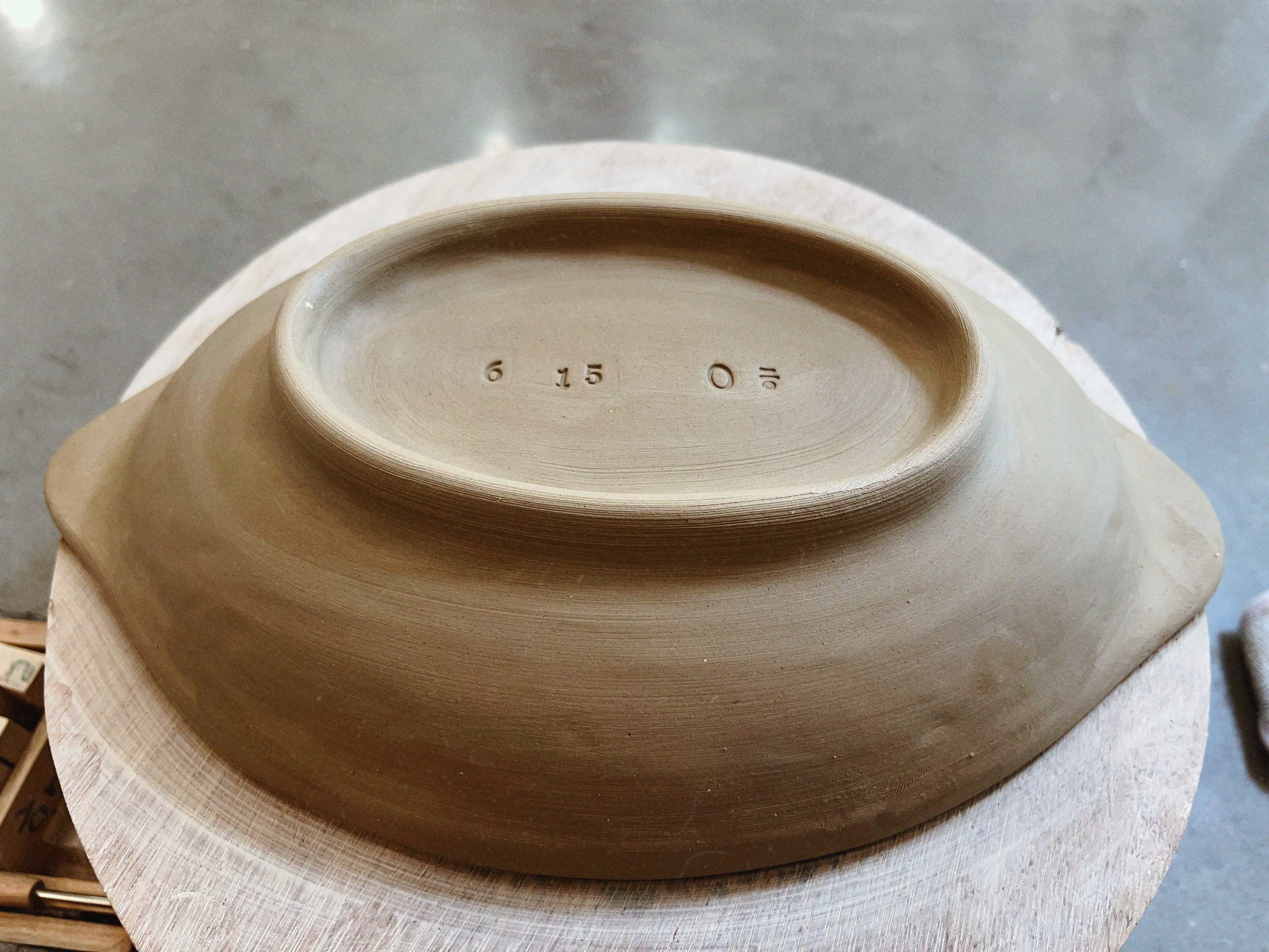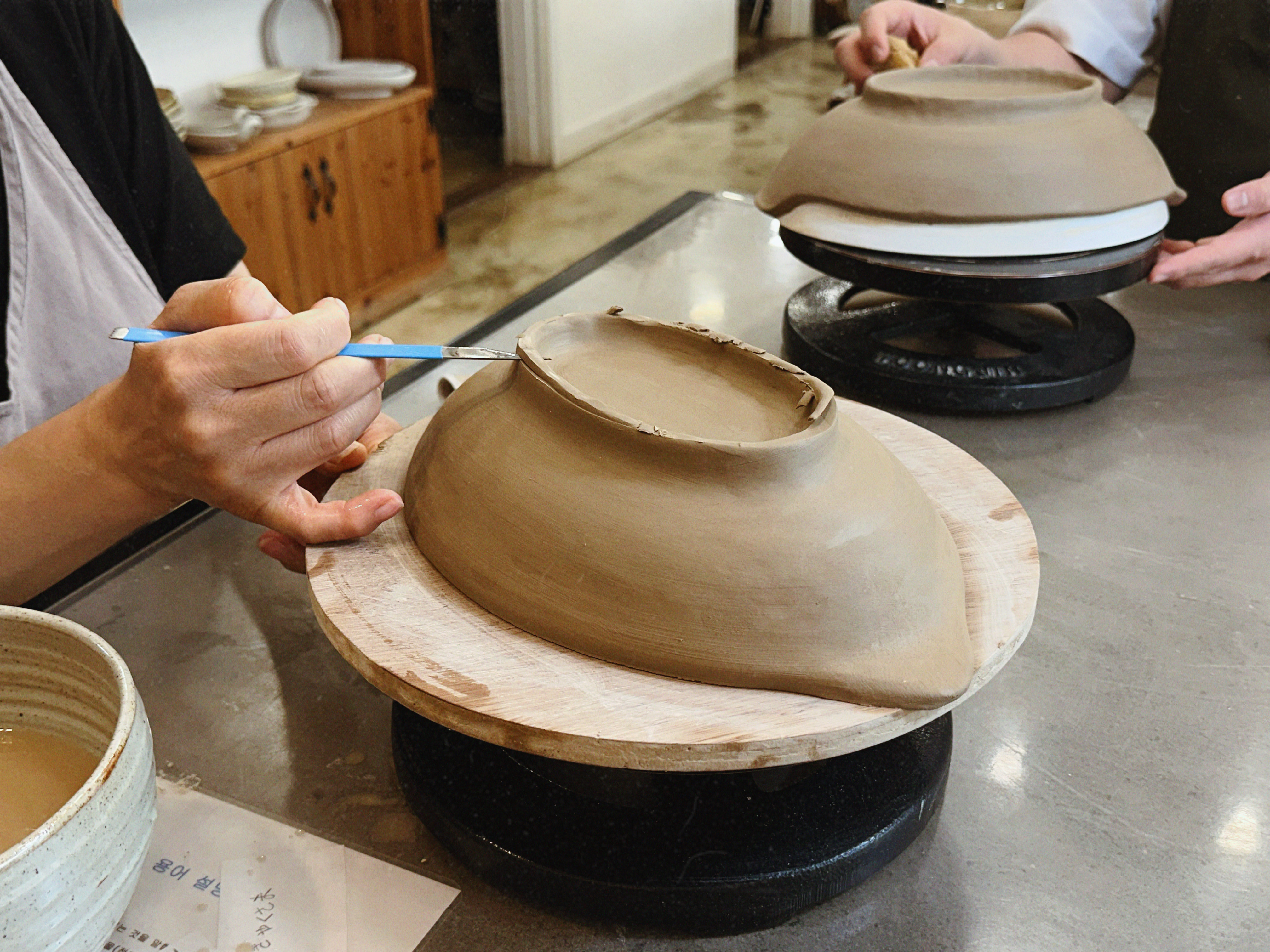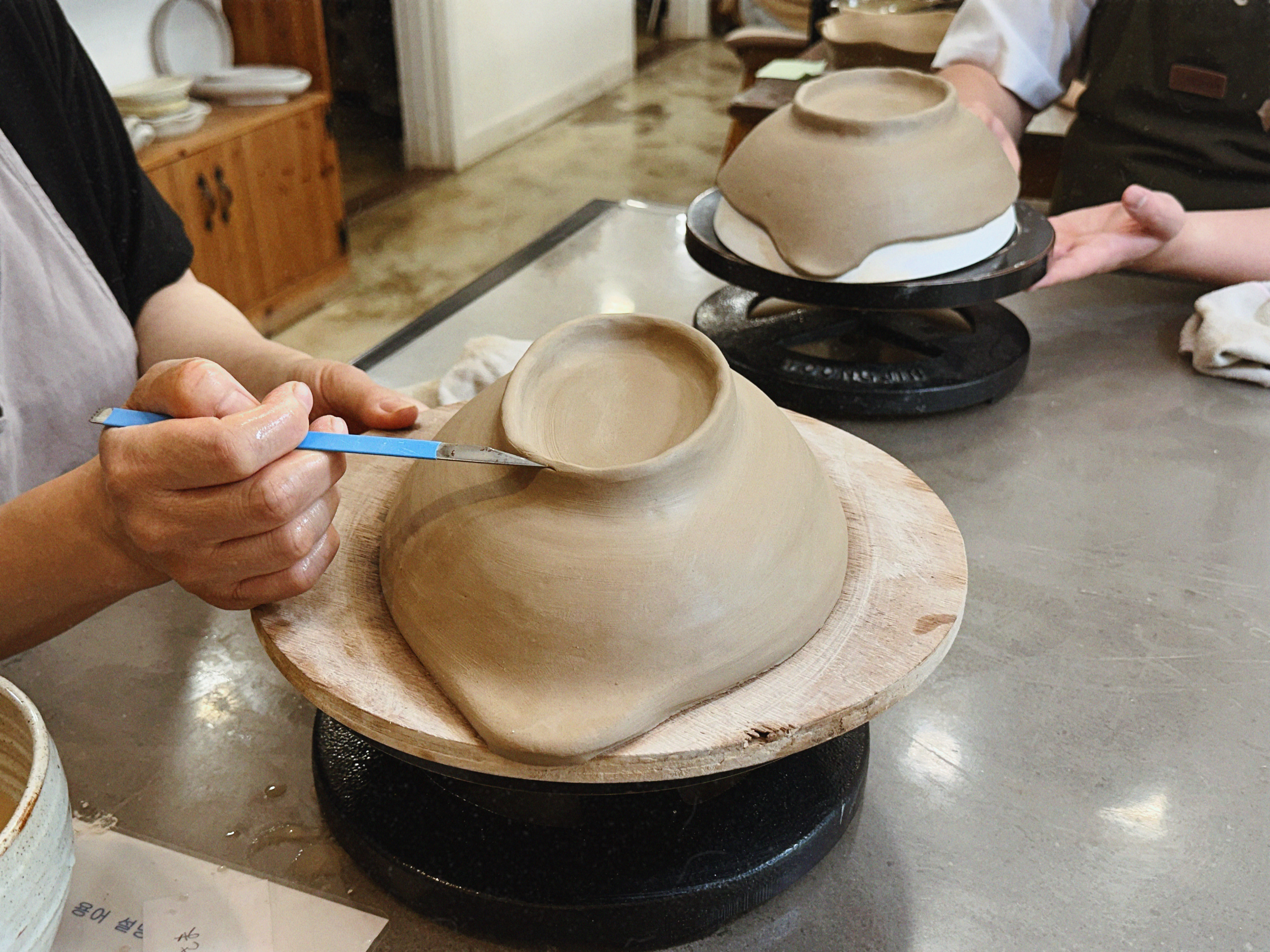 형태가 잡히면 가장 재미있는 단계가 옵니다. 마지막에 우리는 바닥면에 도장으로 날짜와 이니셜을 톡— 찍어 넣었어요. 작품은 공방에서 천천히 말린 뒤 초벌 소성 → 유약 선택·도포 → 재벌 소성을 거치며, 이 모든 과정 때문에 완성품 수령에는 시간이 좀 걸립니다.