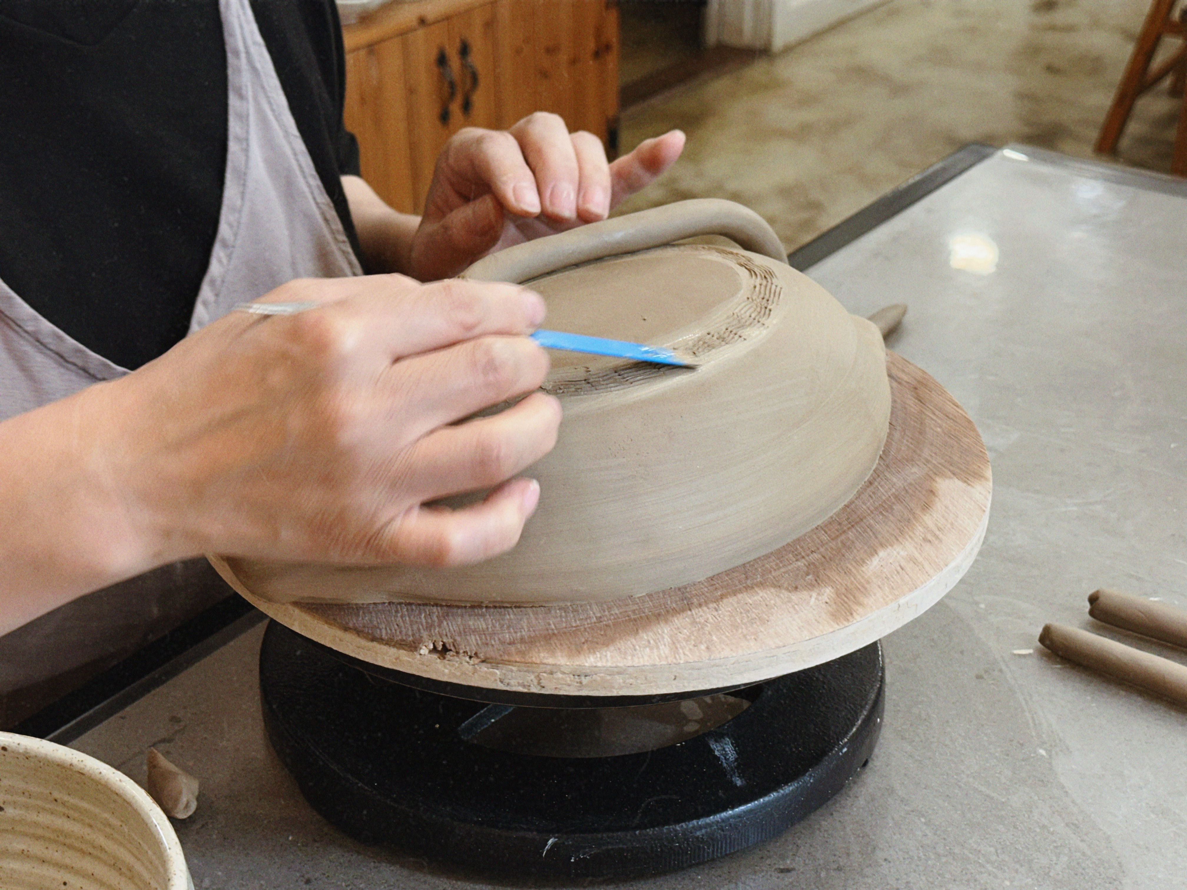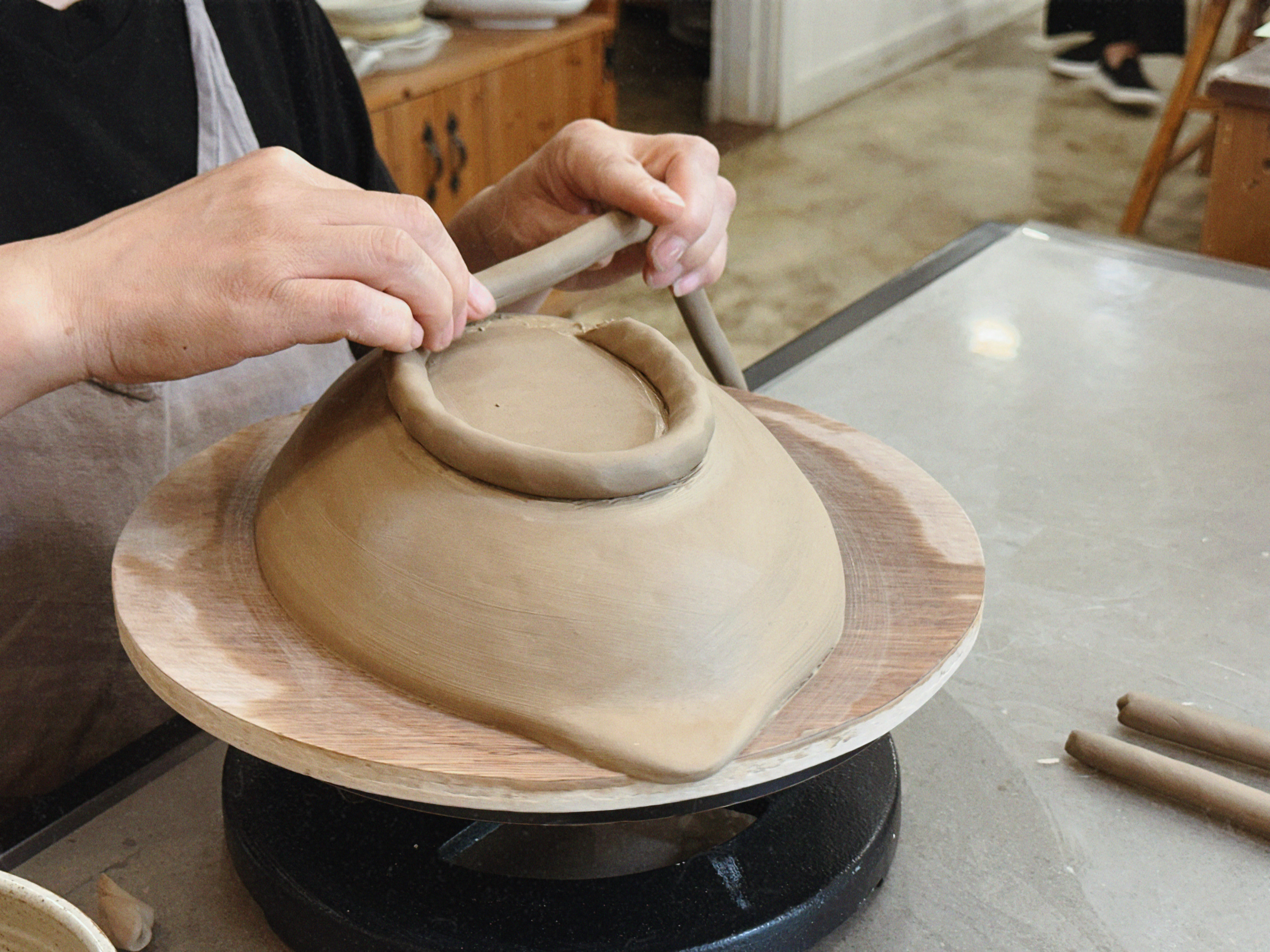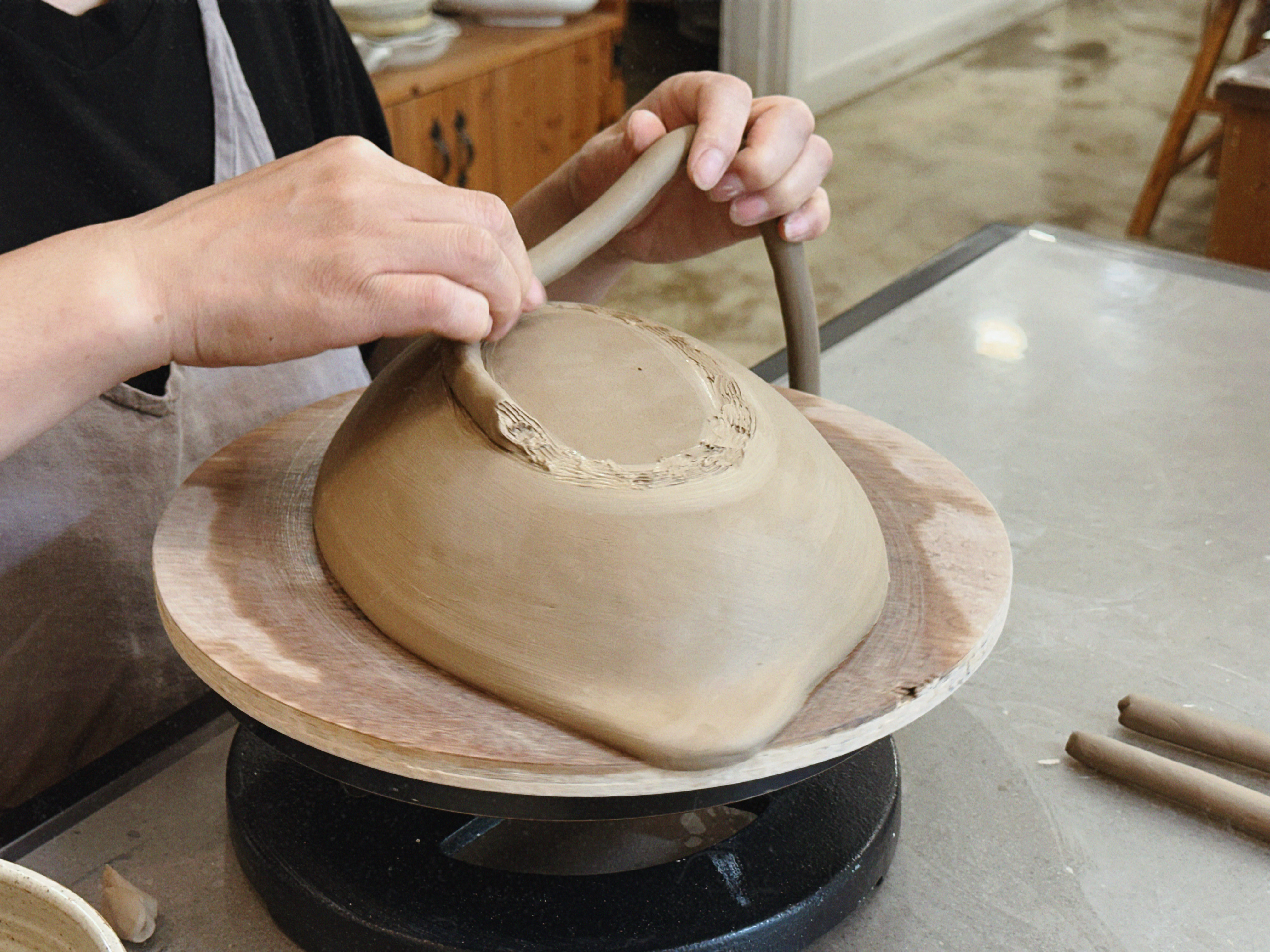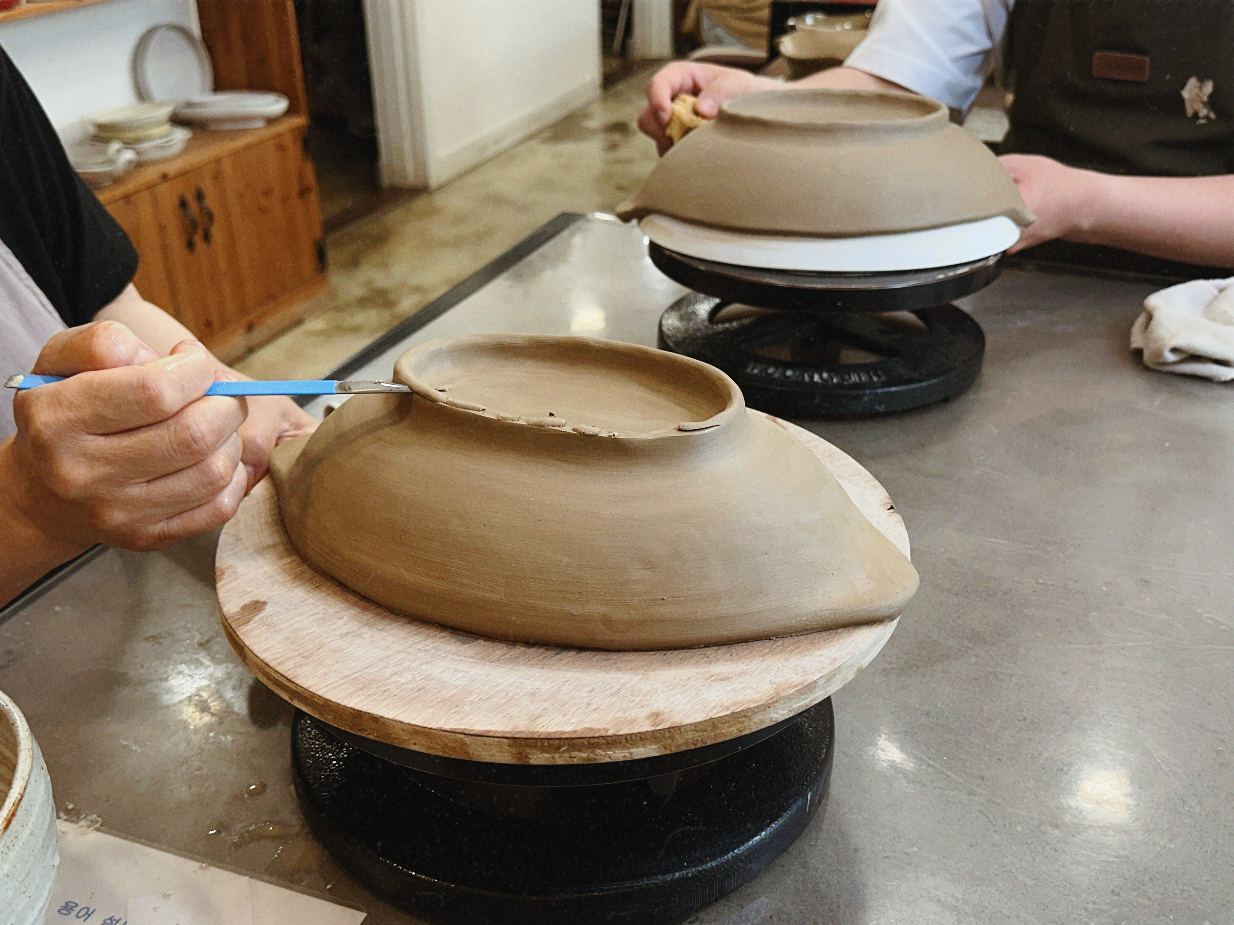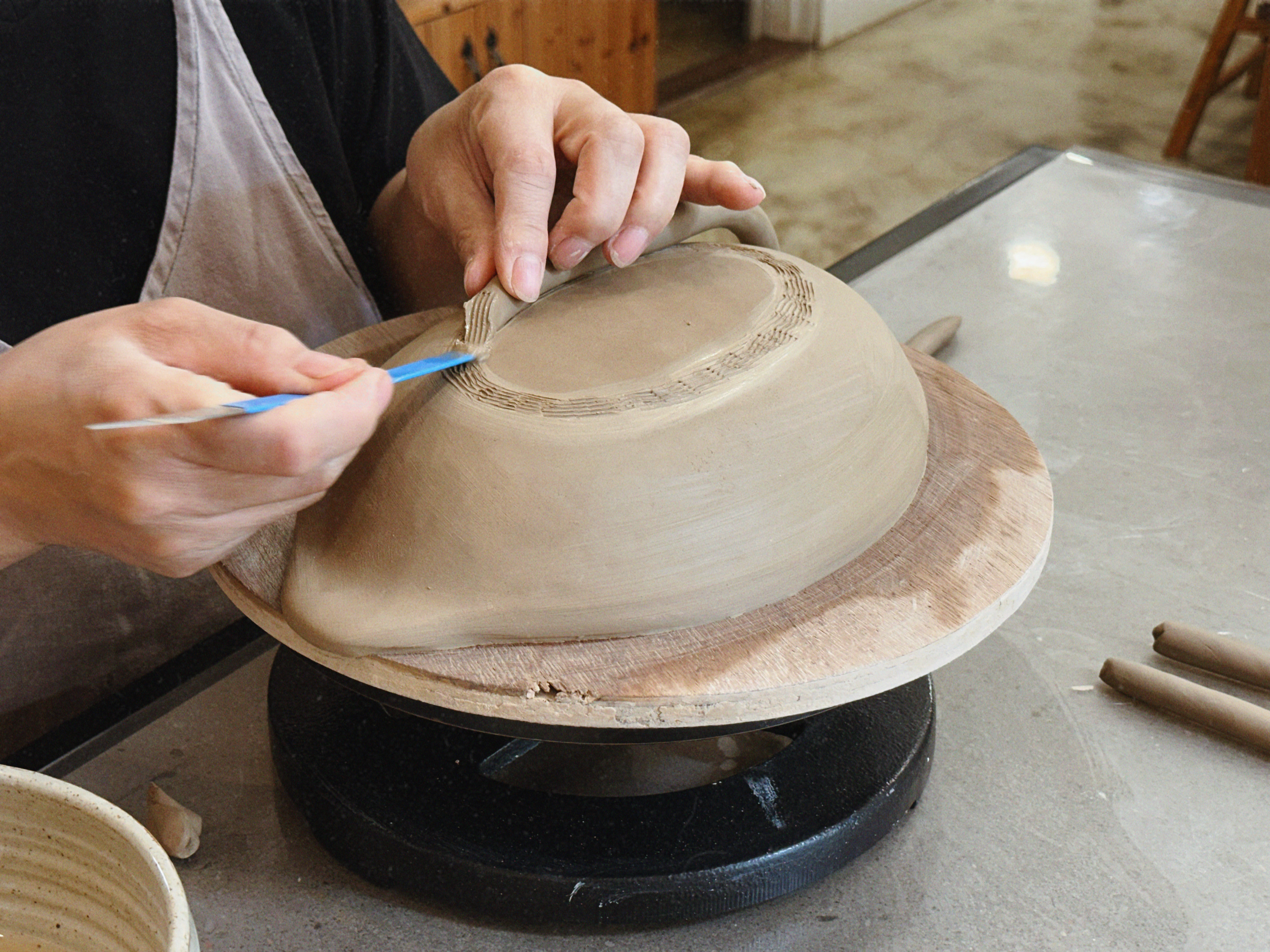 초보가 가장 어려워하는 부분은 ‘두께 균일’과 ‘접합’인데, 선생님이 손에 맞는 작업법을 바로 시연해 주셔서 금방 감을 잡을 수 있었어요. 접합부는 긁어서 거칠게 만든 뒤 슬립(물+점토)을 발라 붙이는 게 핵심! 이 과정을 정확하게 해두면 굽는 동안 갈라질 확률이 확 줄어요.